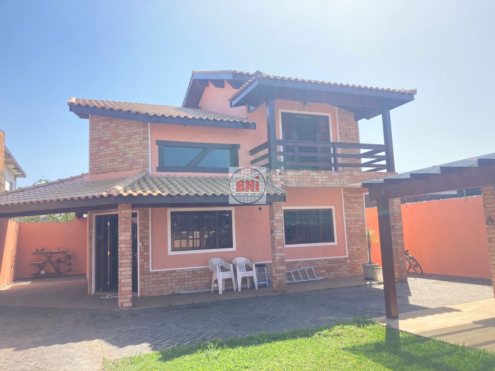 - 6 vagas para carros sendo 1 coberta; Área de lazer arborizada com piscina, ducha, lavabo, armários de despejo, fogão, forno a lenha, pia e churrasqueira; Sala ampla e arejada com dois ambientes, sala de TV e sala de jantar; Cozinha arejada com acesso à área de serviço; 1 banheiro e 1 dormitório sendo suíte no piso térreo; 2 dormitórios no pavimento superior, sendo 1 com varanda, mais um banheiro servindo os dois dormitórios .