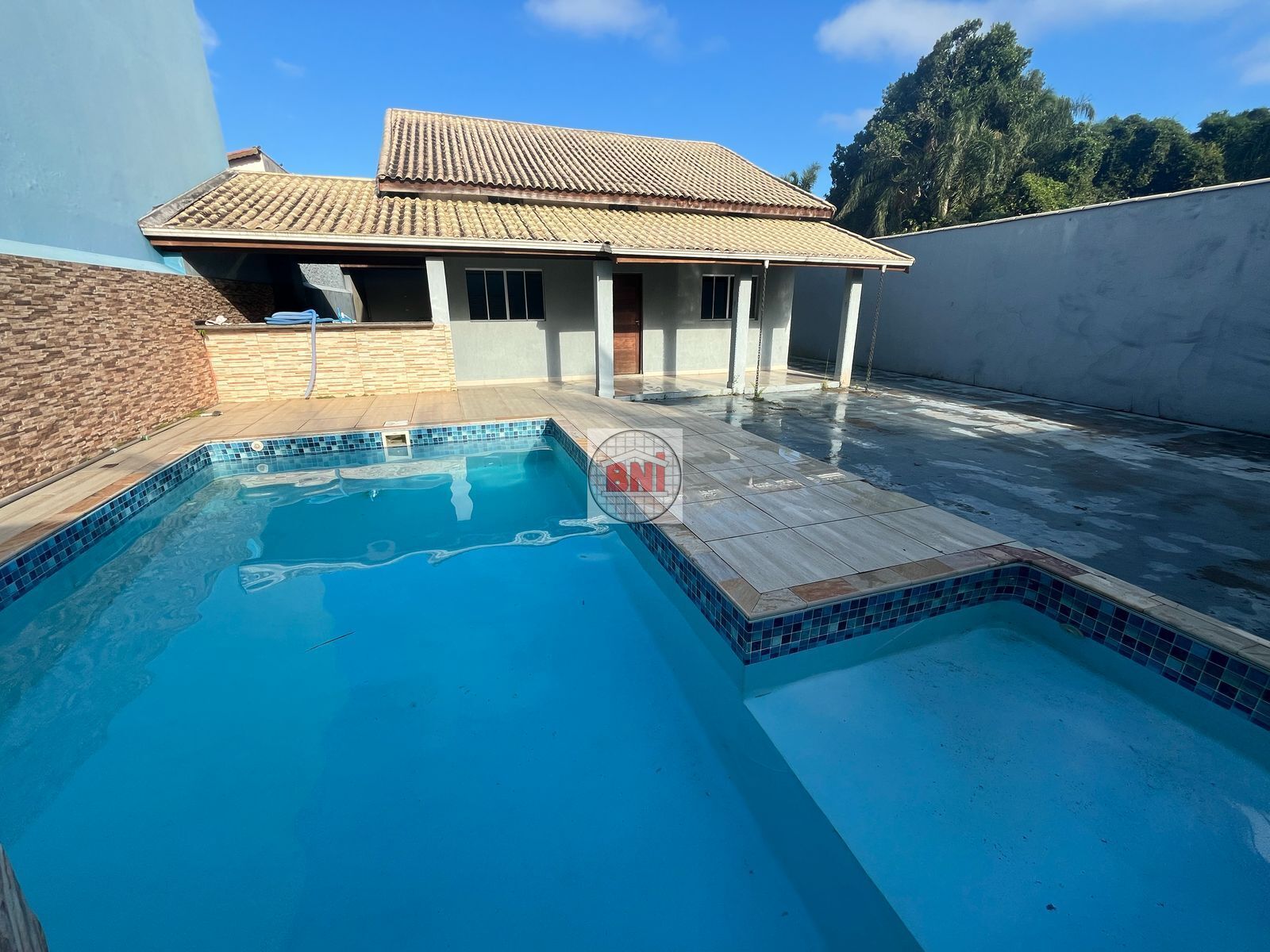 🌊 Piscina grande de vinil com cascata, banco molhado e hidromassagem;