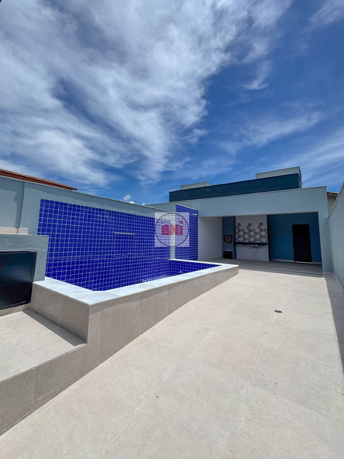 🌊 Piscina de alvenaria com banco molhado e cascata, ducha tira areia logo na entrada;