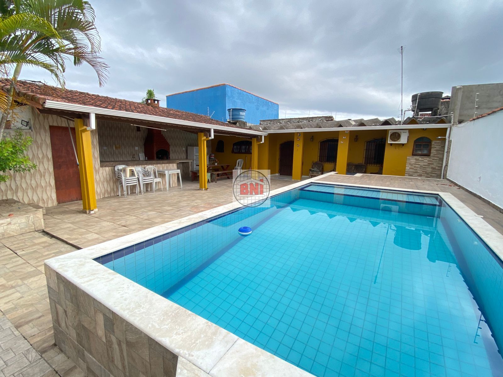 Área externa com 5 vagas, jardim, ducha de praia, piscina em deck alto, lavanderia e espaço do churras coberto e wc.